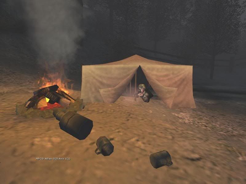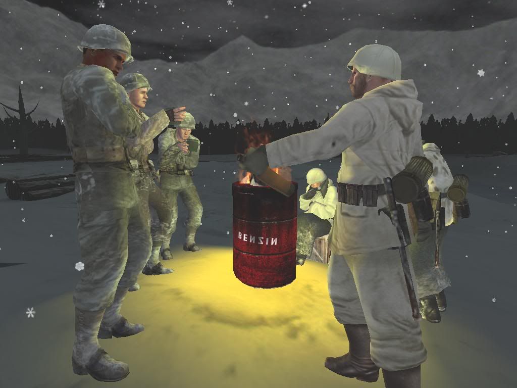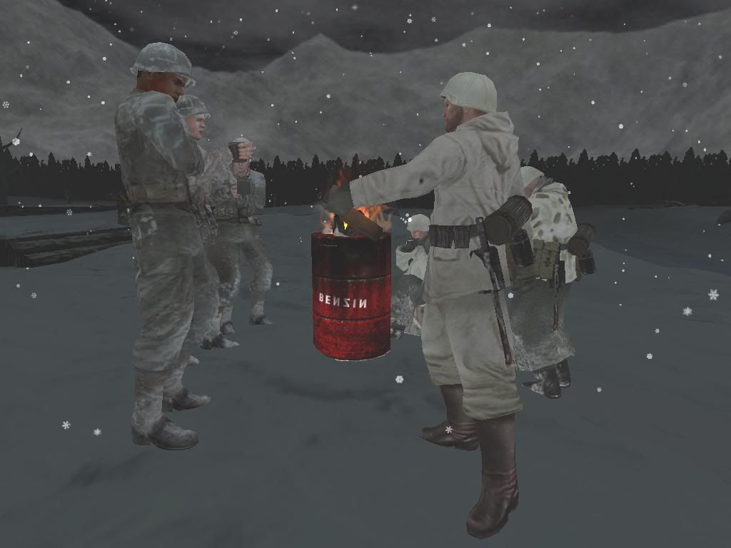 Alex, I had to change your fog settings because I was getting that "Purple Nvidia fog" I remember from years ago. I bought a "cheap" Nvidia card for the time being for my new rig untl I can afford the ATI one I want. I ramped up the snow, added the barrel(why is SH the only one with a barrel model?), camp fire (BT) and used the SH anims. What took the longest actually was adding the wine bottle to the AI's hand and have it positioned correctly. That is the canteen_pass_idle anim, but the positioning of the bottle was all wrong so I had to do some trial and error to get it correct. It started out as only two soldiers, but I am happy with the result. I wanted to use Kruger's map as the backdrop of this one and I have plans for using it in another one.
